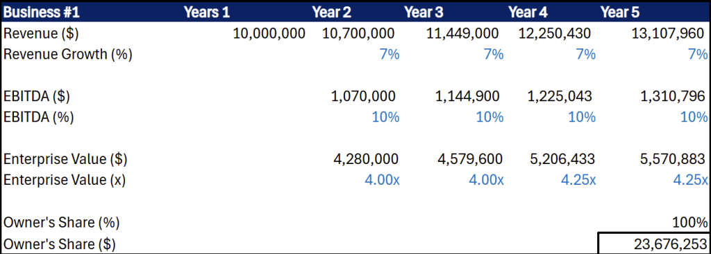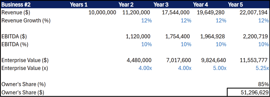 Now let’s look at Business #2 that takes on equity capital that allows for one acquisition in year 3, investment into a business development resource, technology investments, and a couple key managers (let’s say the technology efficiencies and management team cancel out any EBITDA margin improvements). The owner sells 15% of the business to accomplish this. The result of the remaining 85% is much higher than it would be without the investments.